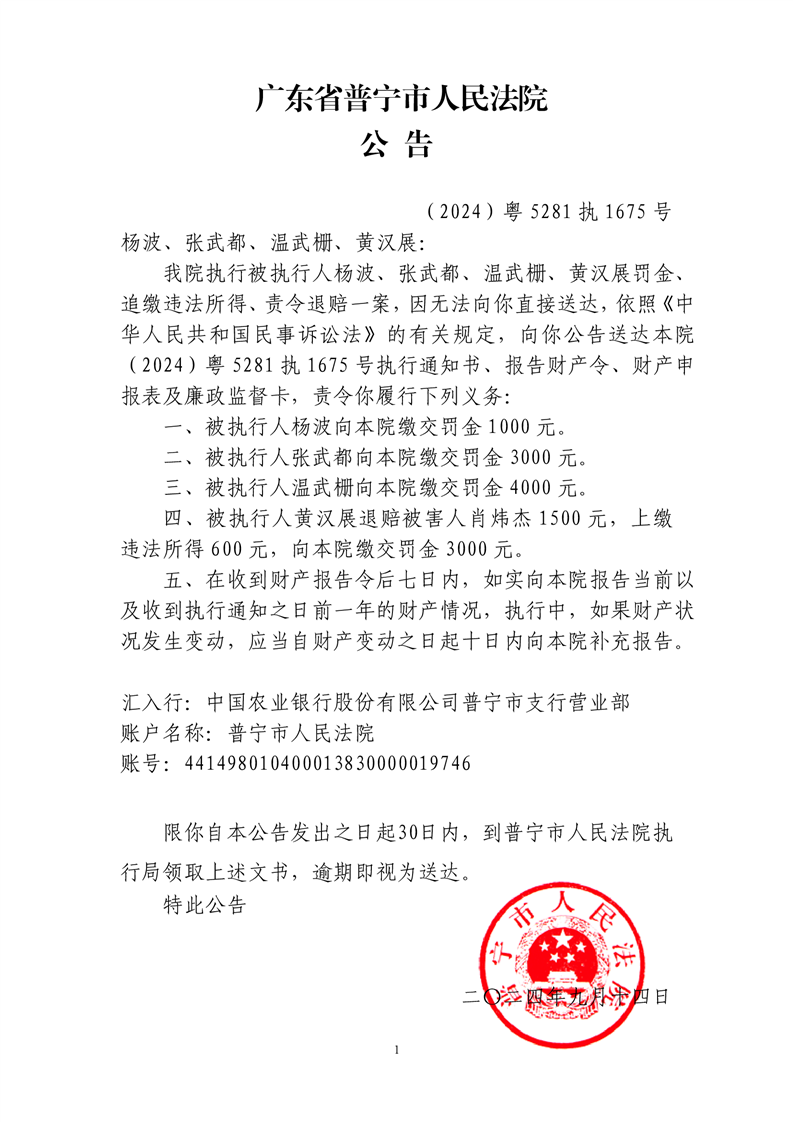 普宁法院执行通知公告(杨波、张武都、温武栅、黄汉展)