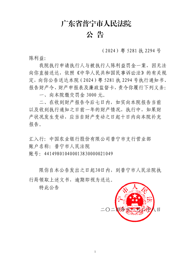 普宁法院执行通知书公告(居麦克孜·吐尼亚孜)
