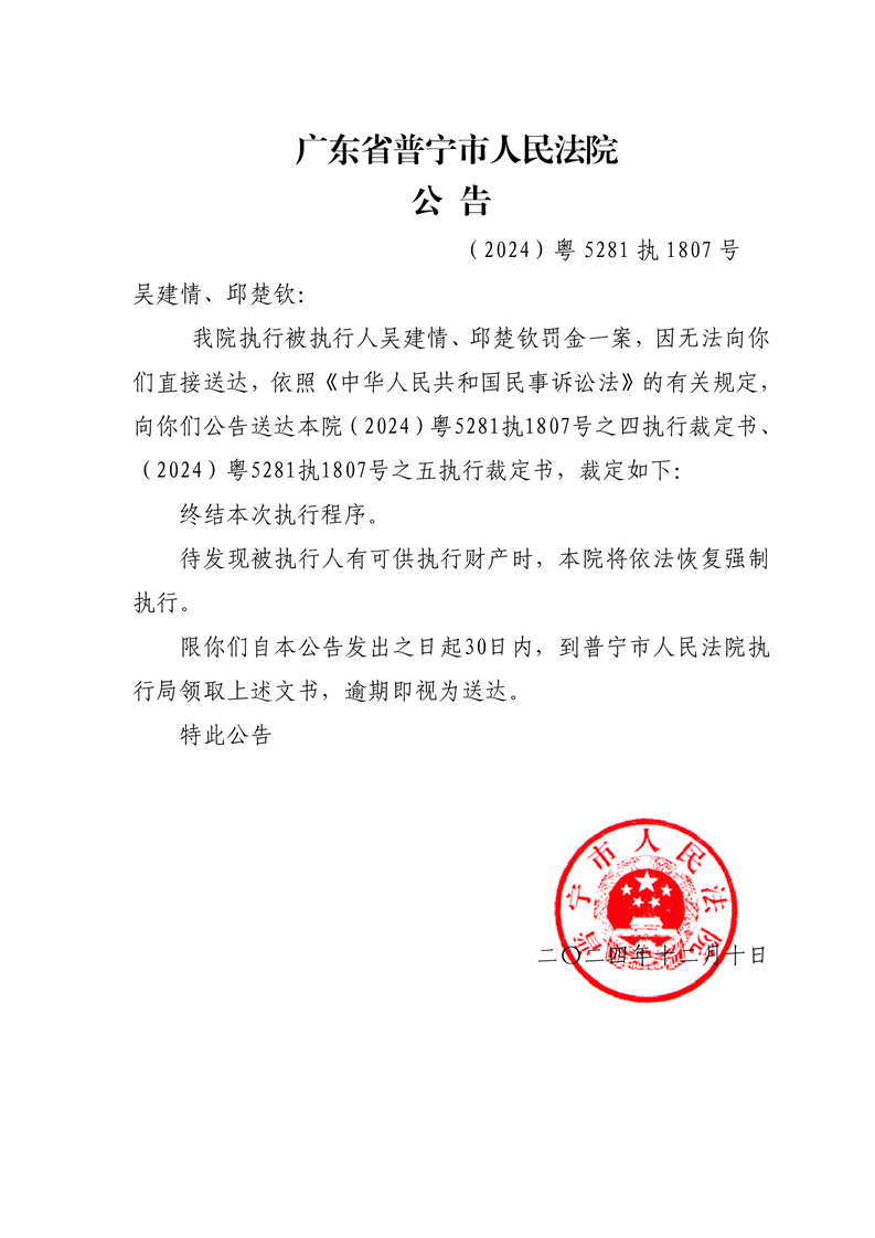 普宁法院终本裁定公告(吴建情、邱楚钦)