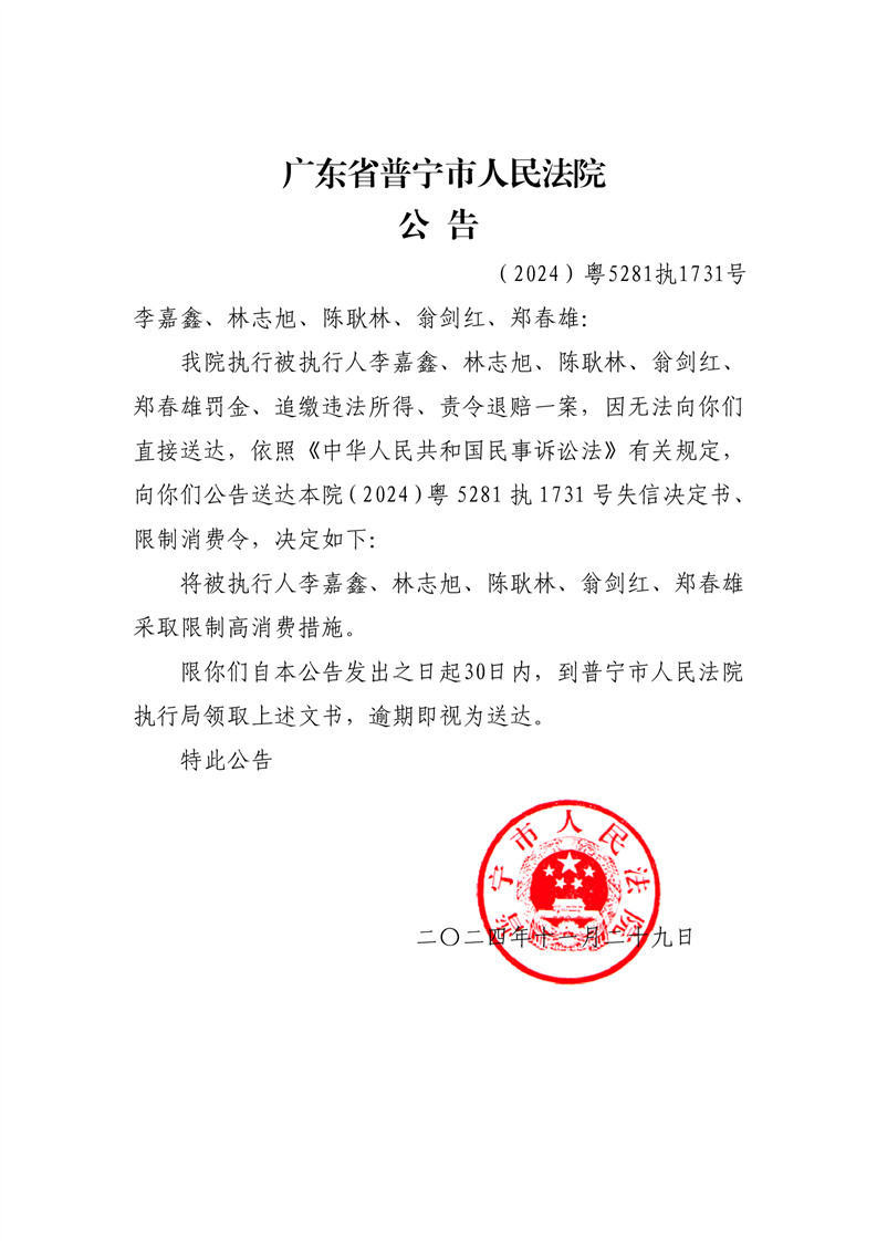 普宁法院公告限高(李嘉鑫、林志旭、陈耿林、翁剑红、郑春雄)
