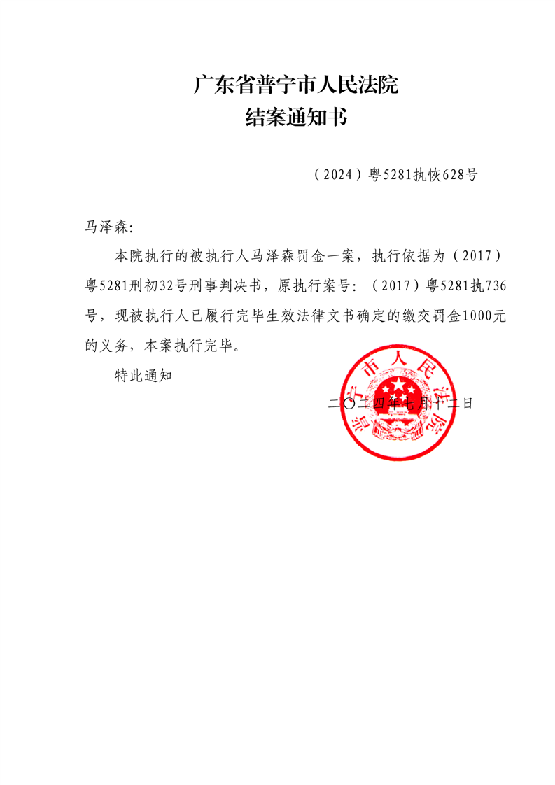 普宁法院公告结案通知书(马泽森)