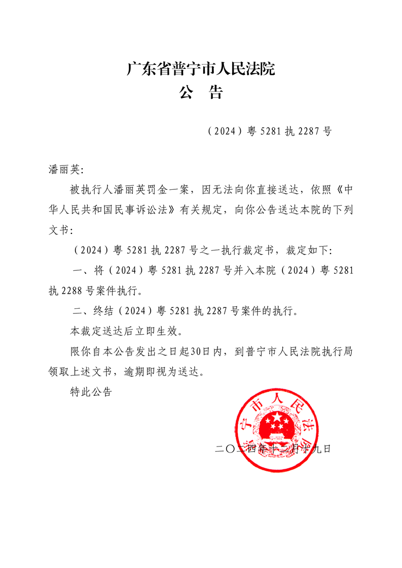 普宁法院公告终结执行裁定书(潘丽英)