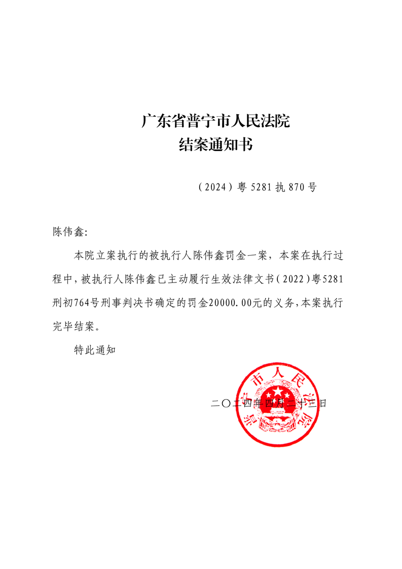 普宁市人民法院公告结案通知书(陈伟鑫)