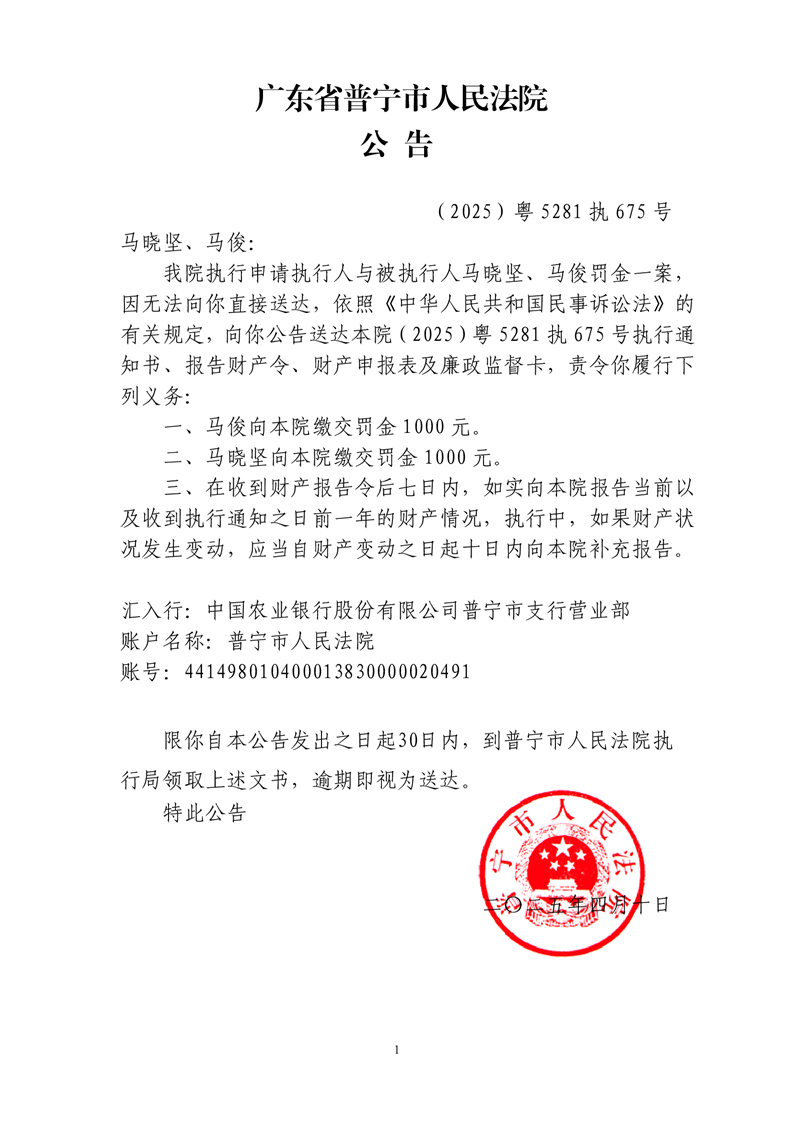 普宁人民法院公告执行通知书(马俊、马晓坚)