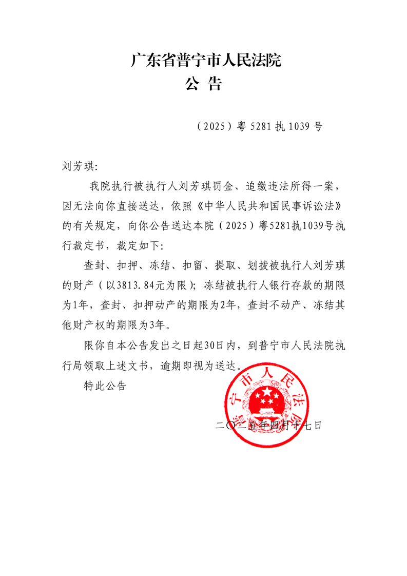 普宁法院公告执行裁定书(刘芳琪)
