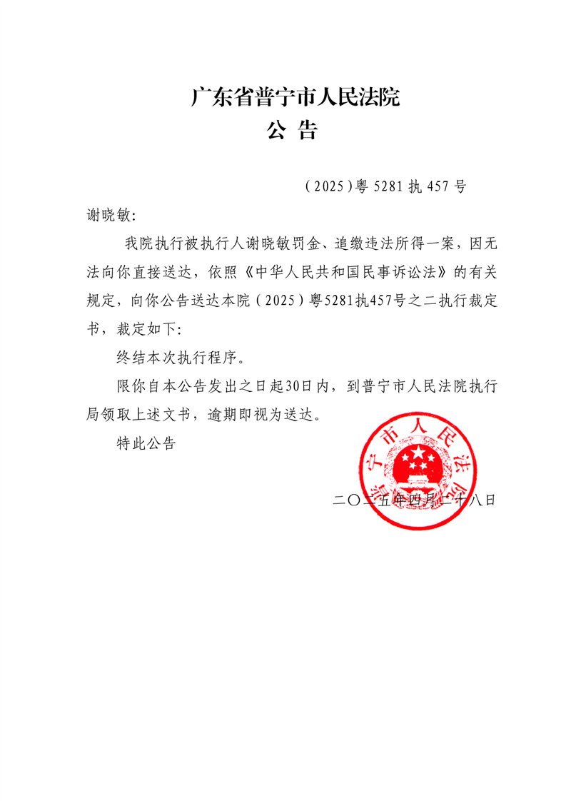 普宁法院公告送达终结本次执行裁定书(谢晓敏)