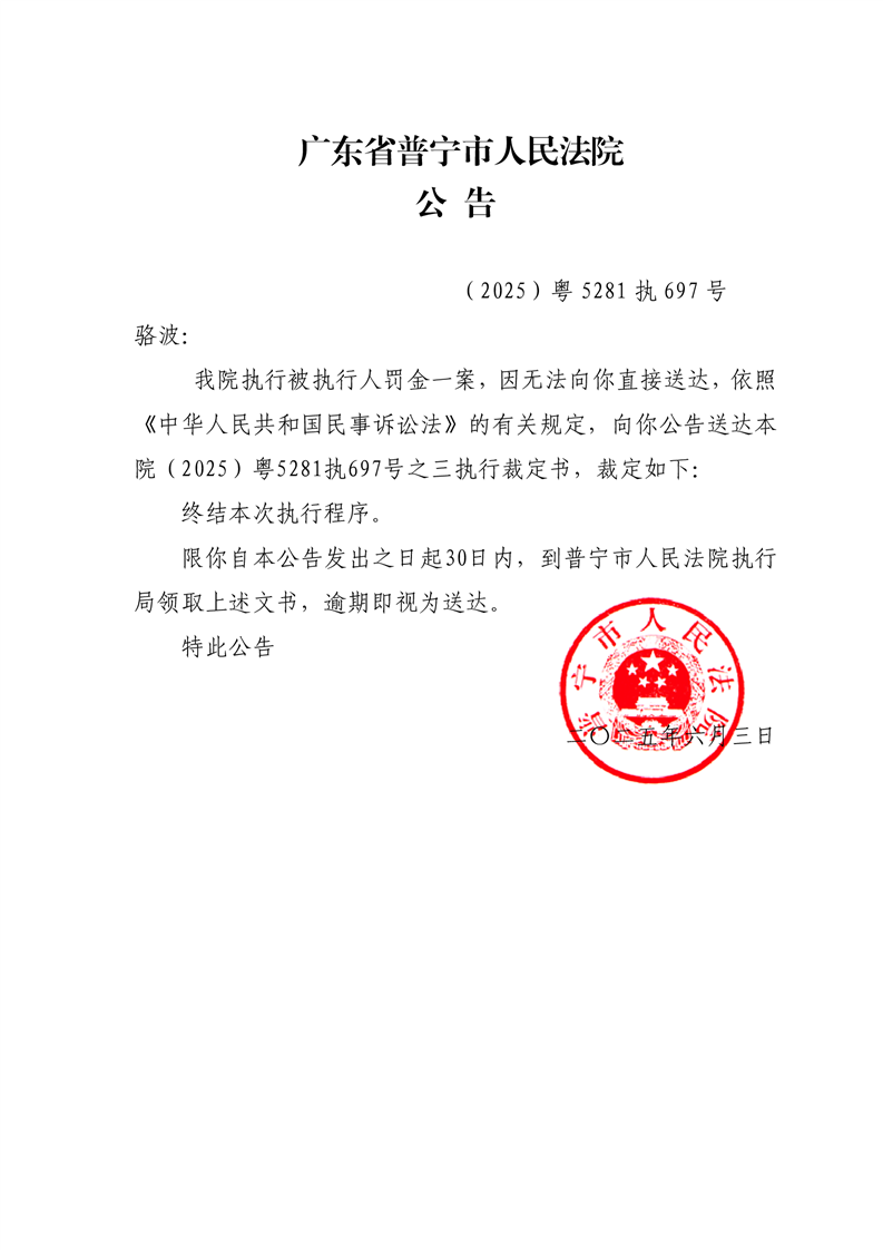 普宁法院公告终结本次执行裁定书(骆波)