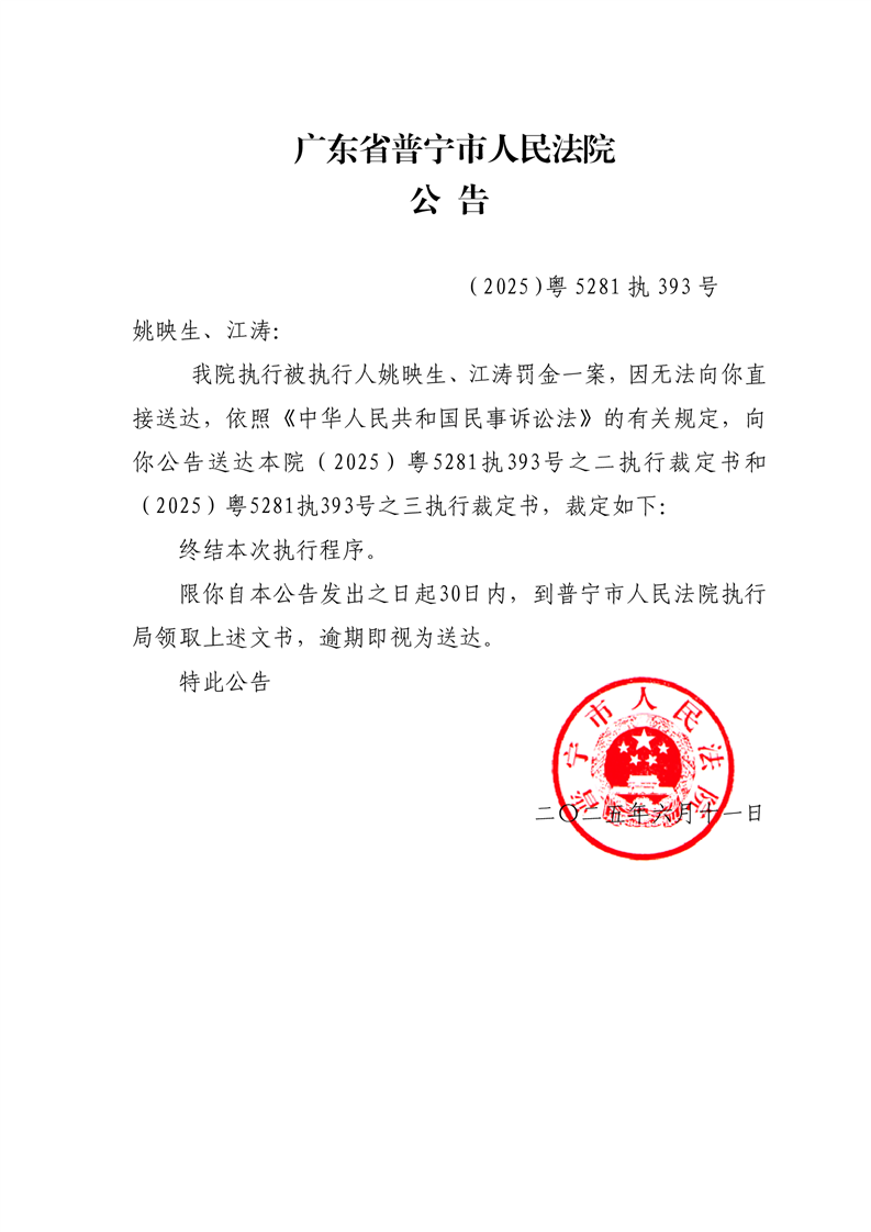 普宁法院公告终结本次执行裁定书(姚映生、江涛)