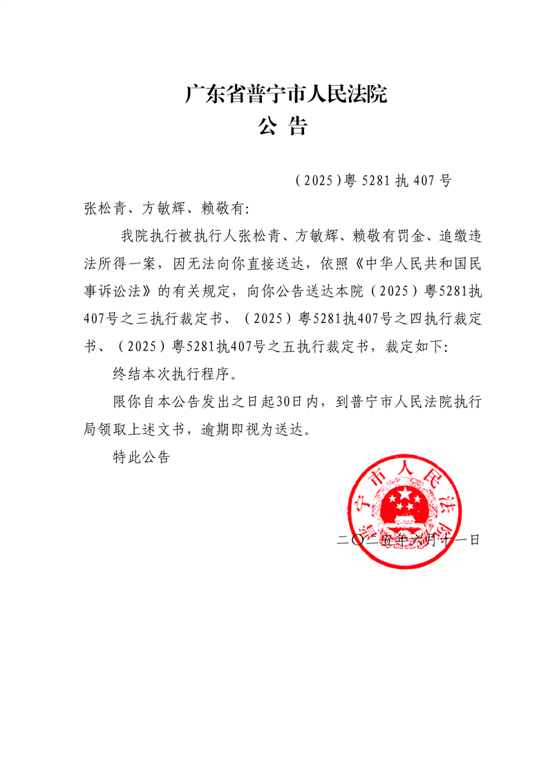 普宁法院公告终结本次执行裁定书(张松青、方敏辉、赖敬有)