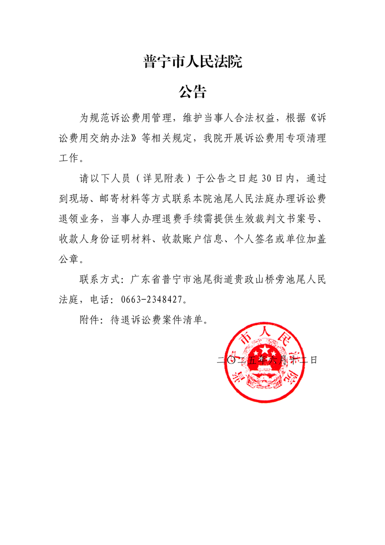 普宁法院退费公告