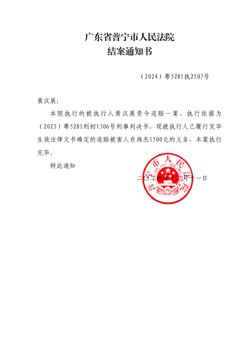 普宁法院公告结案通知书(黄汉展).