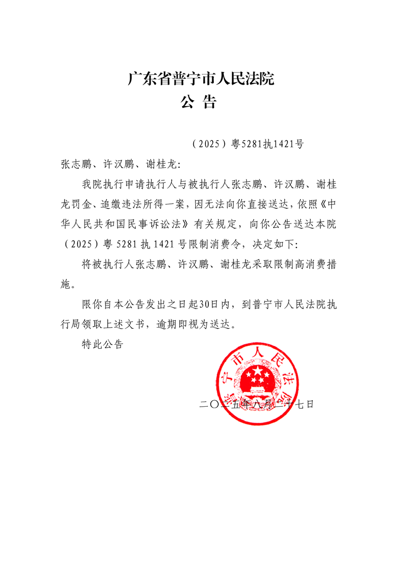普宁法院公告送达限制消费令(张志鹏、许汉鹏、谢桂龙)