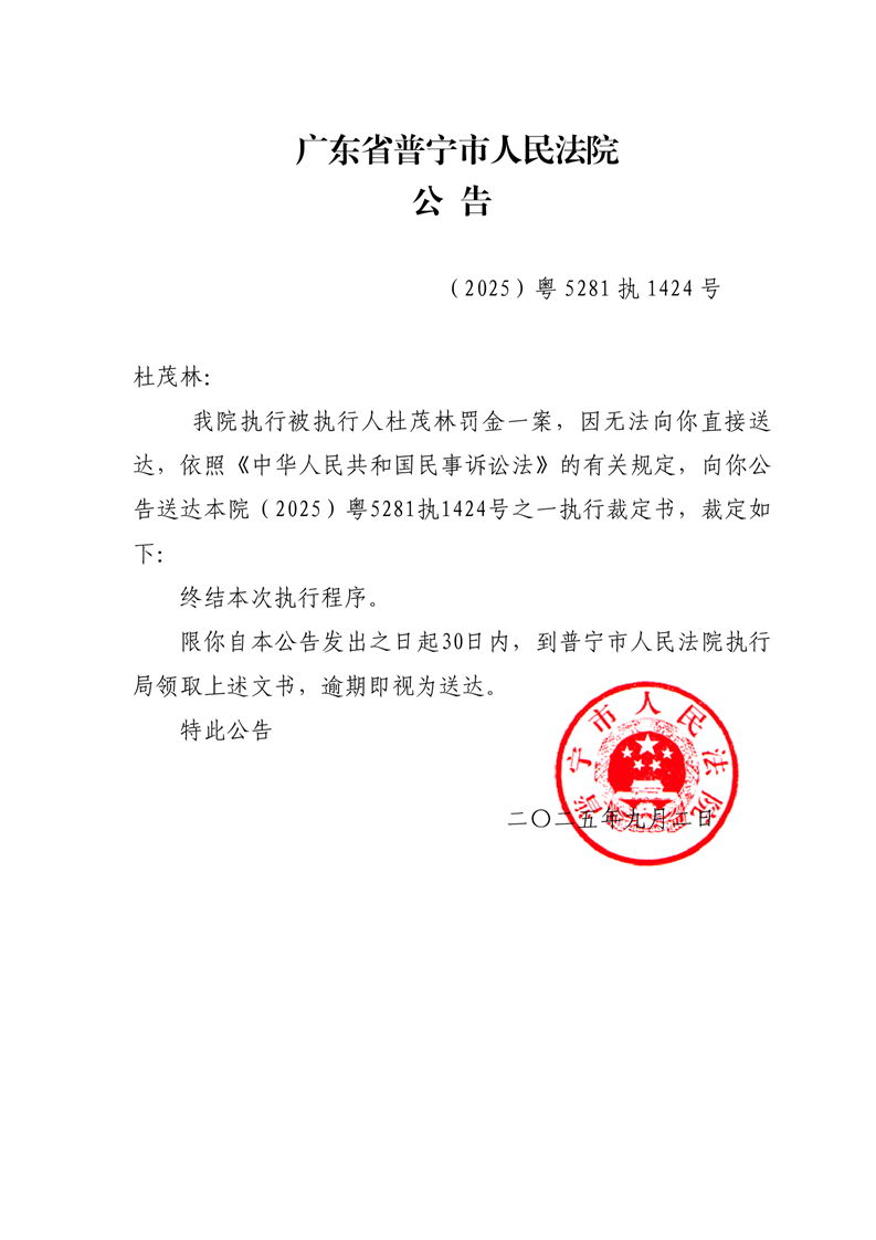 普宁法院公告送达并案、终结执行裁定(杜俊钦)