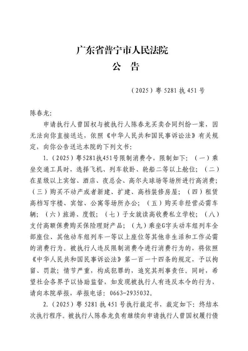 普宁法院送达公告-陈春龙