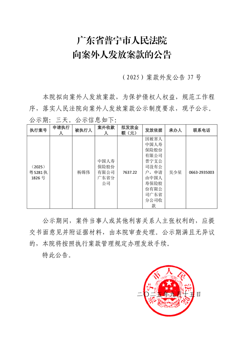 向案外人发放案款公告37号【案号(2025)粤5281执1826号】