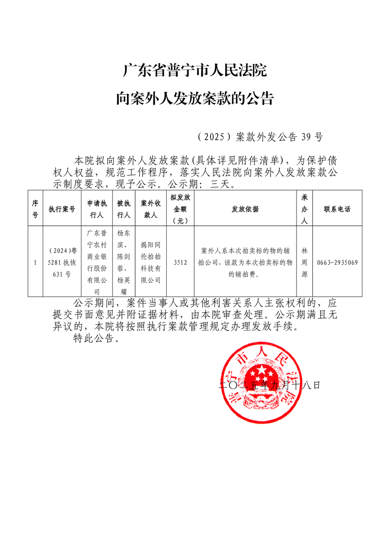 (2025)案款外发公告39号-(2024)粤5281执恢631号