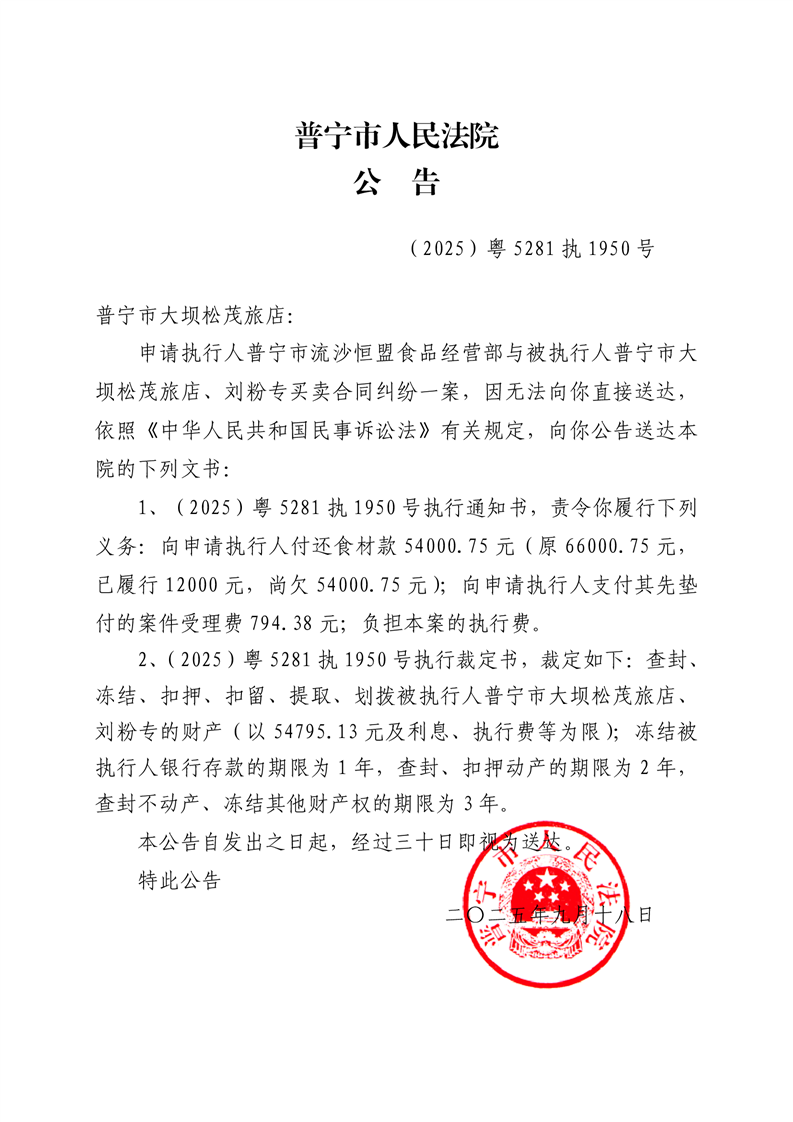 普宁市人民法院送达公告(普宁市大坝松茂旅店)