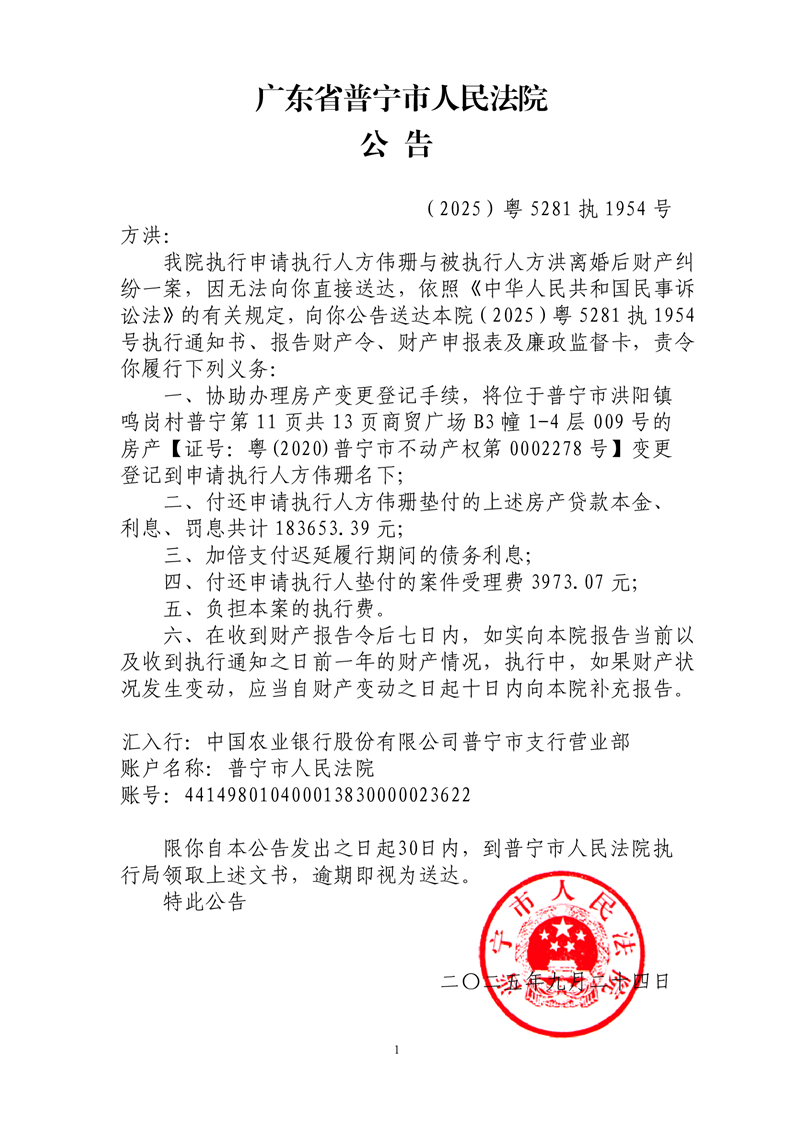 普宁法院公告送达(方洪)