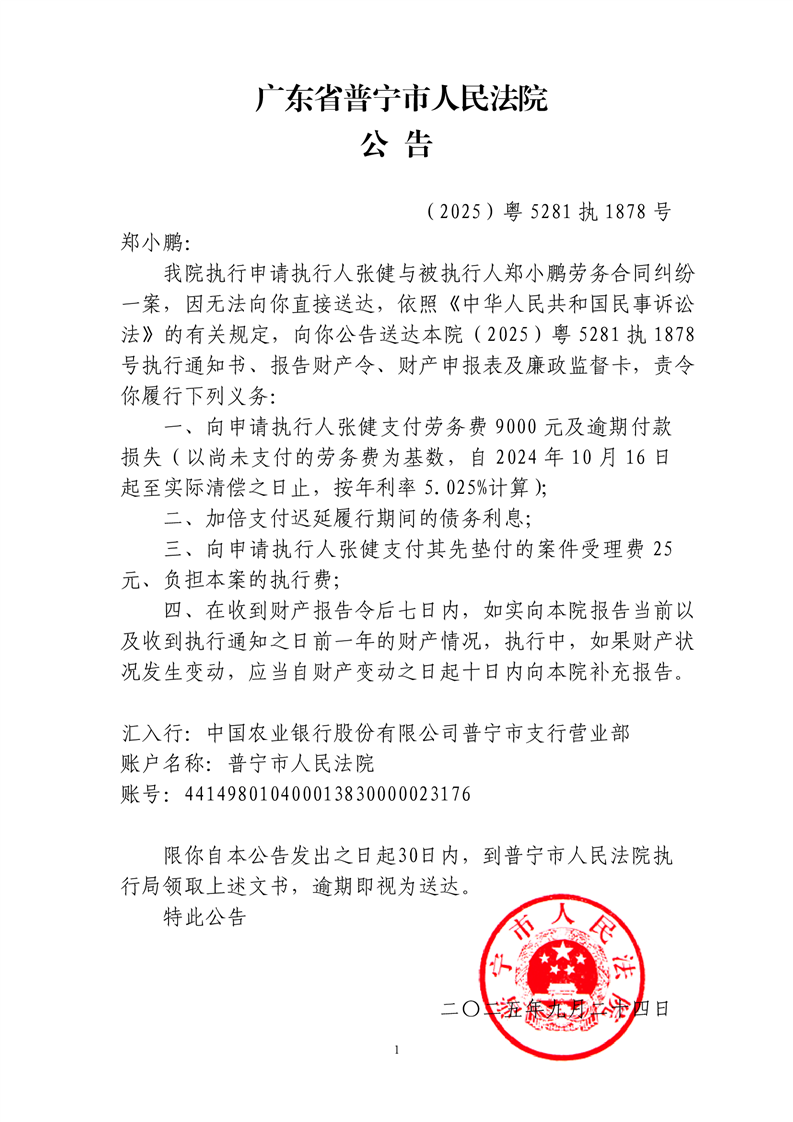 普宁法院公告送达(郑小鹏)