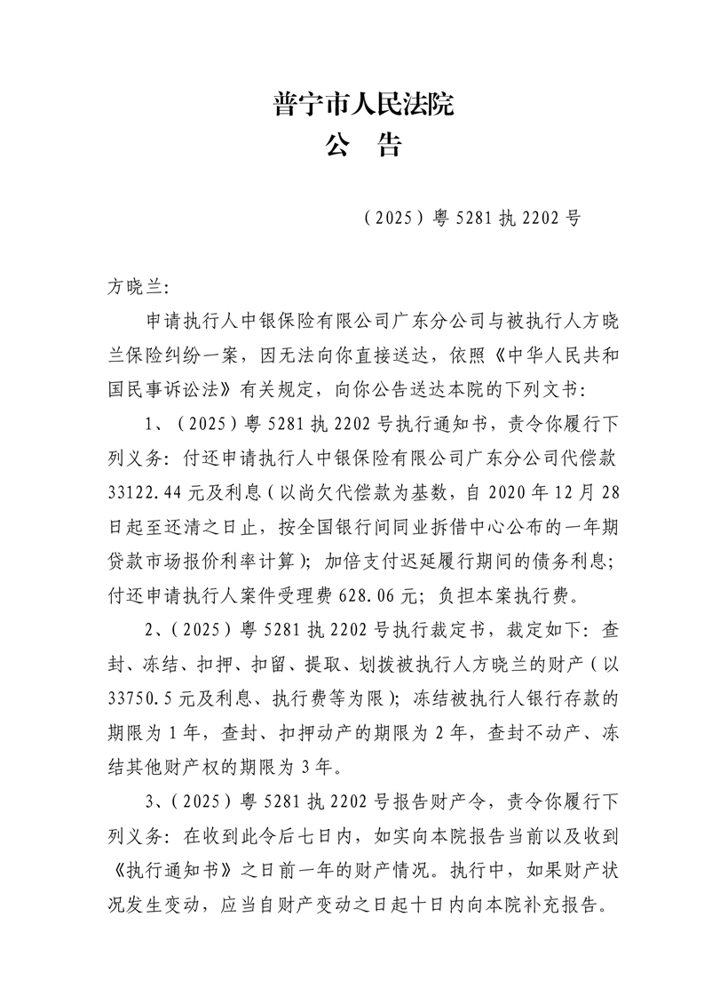 普宁法院送达公告(方晓兰)