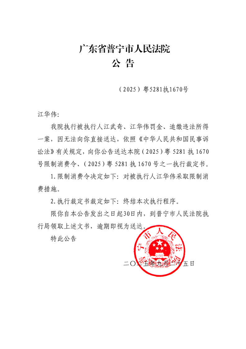 普宁法院送达公告(江华伟)