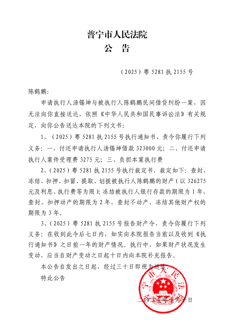 普宁法院送达公告(陈鹤鹏)