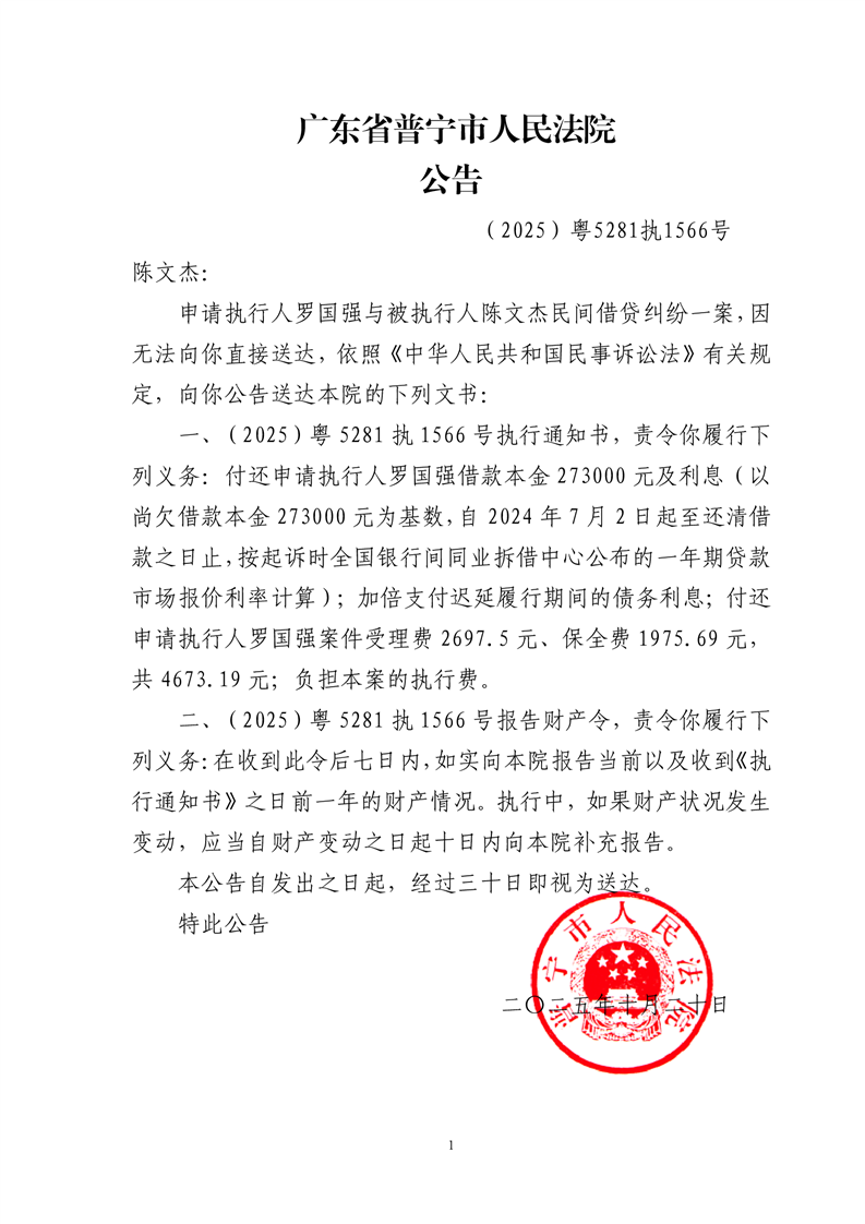 普宁法院送达公告-陈文杰