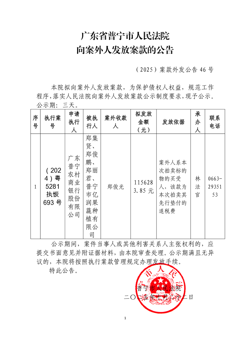 向案外人发放案款公告(2025)46号