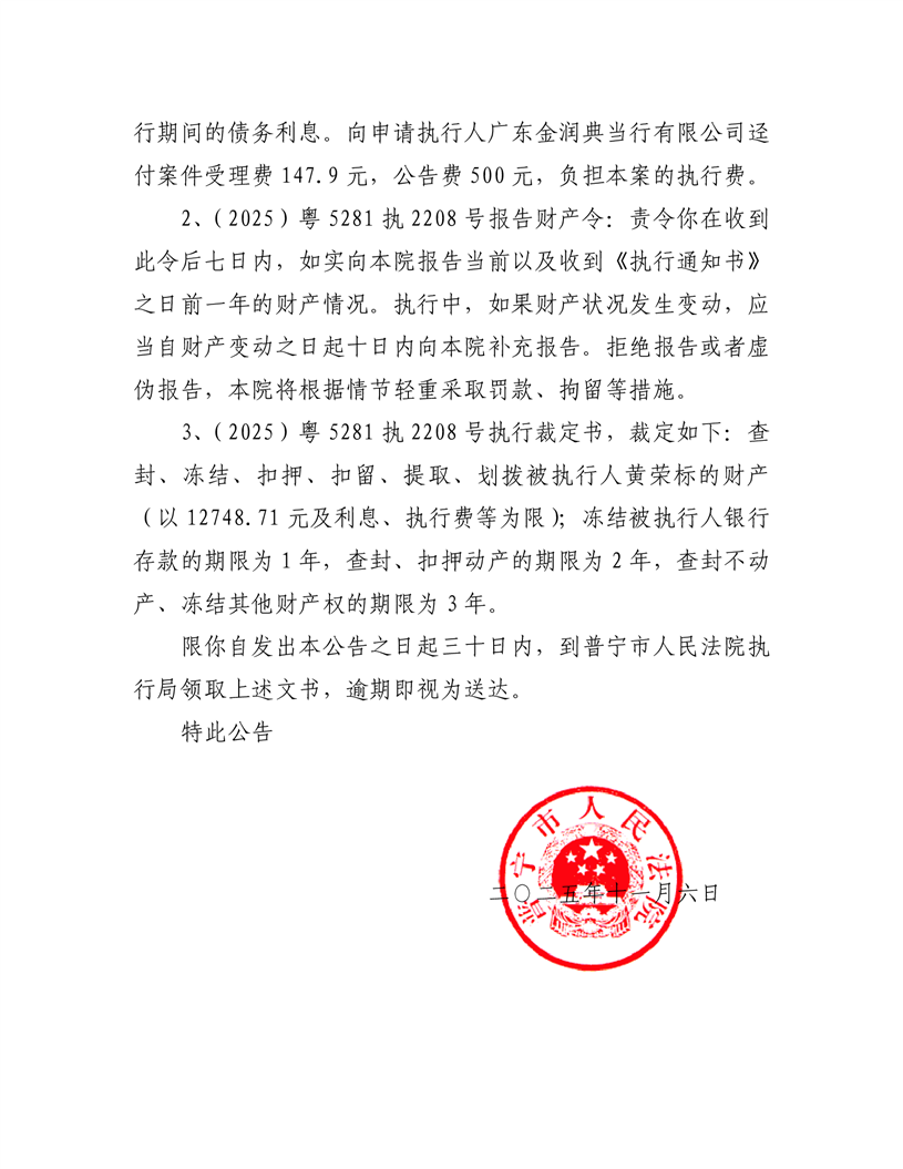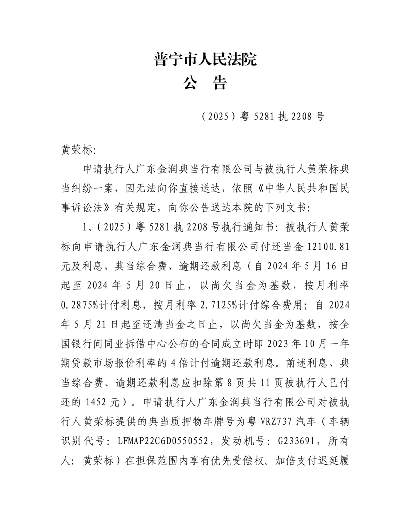普宁法院送达公告(普宁市利信融资担保有限公司、黄志浩、黄奕龙)