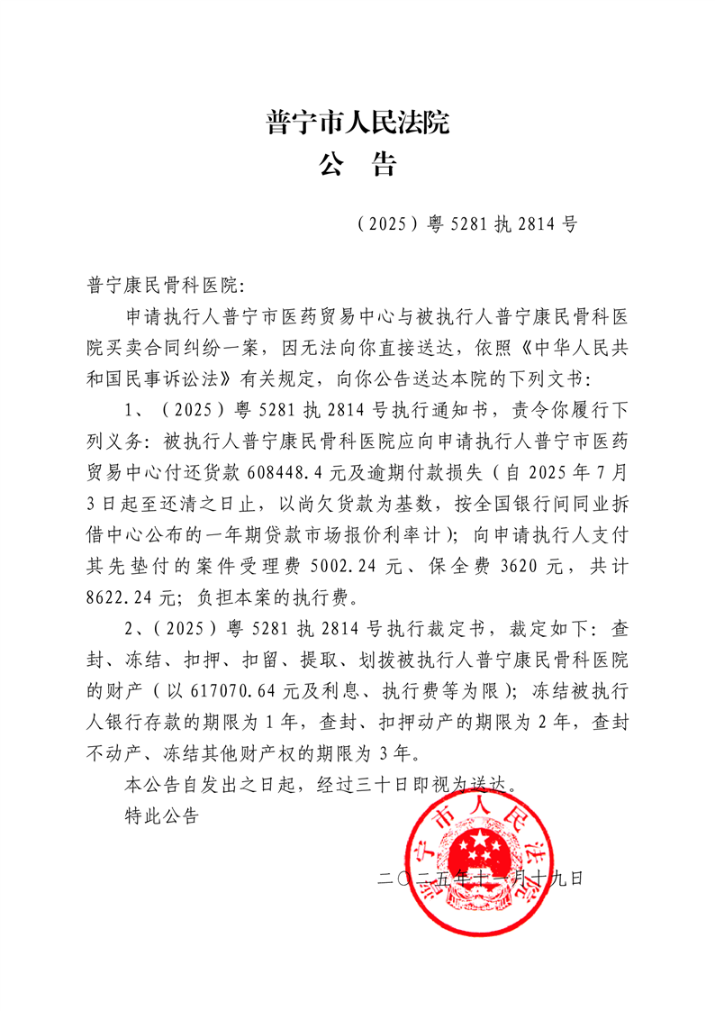普宁人民法院送达公告(普宁康民骨科医院)