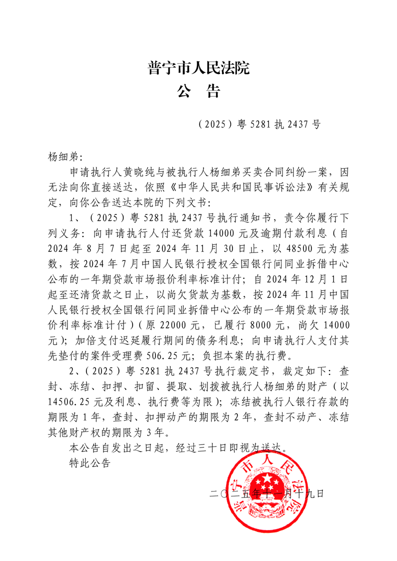 普宁人民法院送达公告(杨细弟)