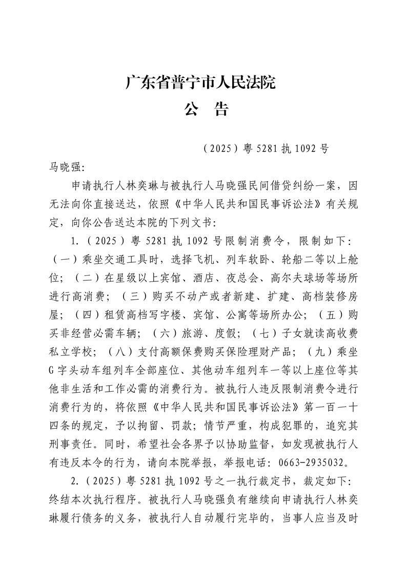 普宁法院送达公告-马晓强