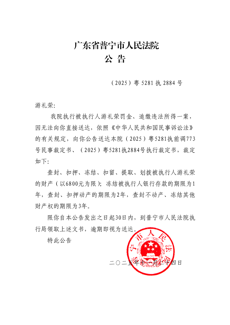 普宁法院送达公告(游礼荣)