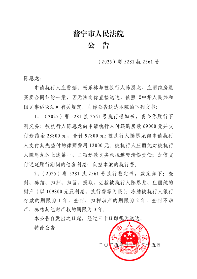 普宁市人民法院送达公告(陈恩龙)