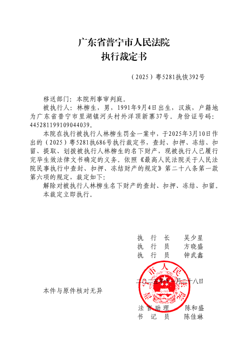 普宁法院公告送达解除执行裁定书(林柳生)