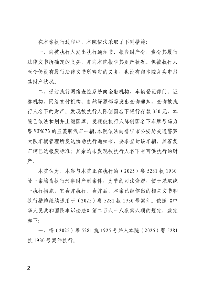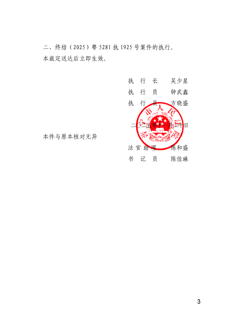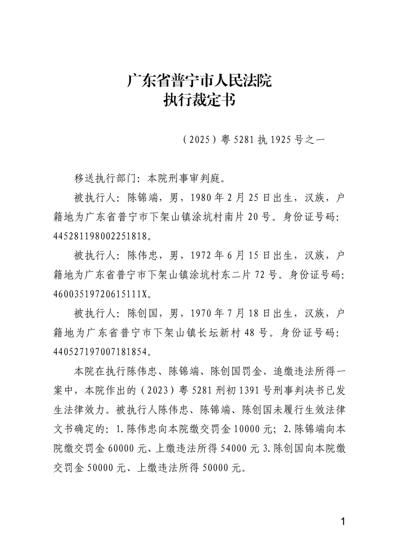 普宁法院公告送达终结执行裁定书(陈锦端、陈伟忠、陈创国)
