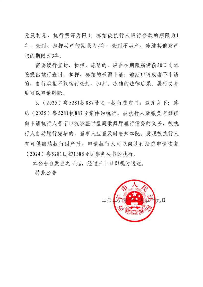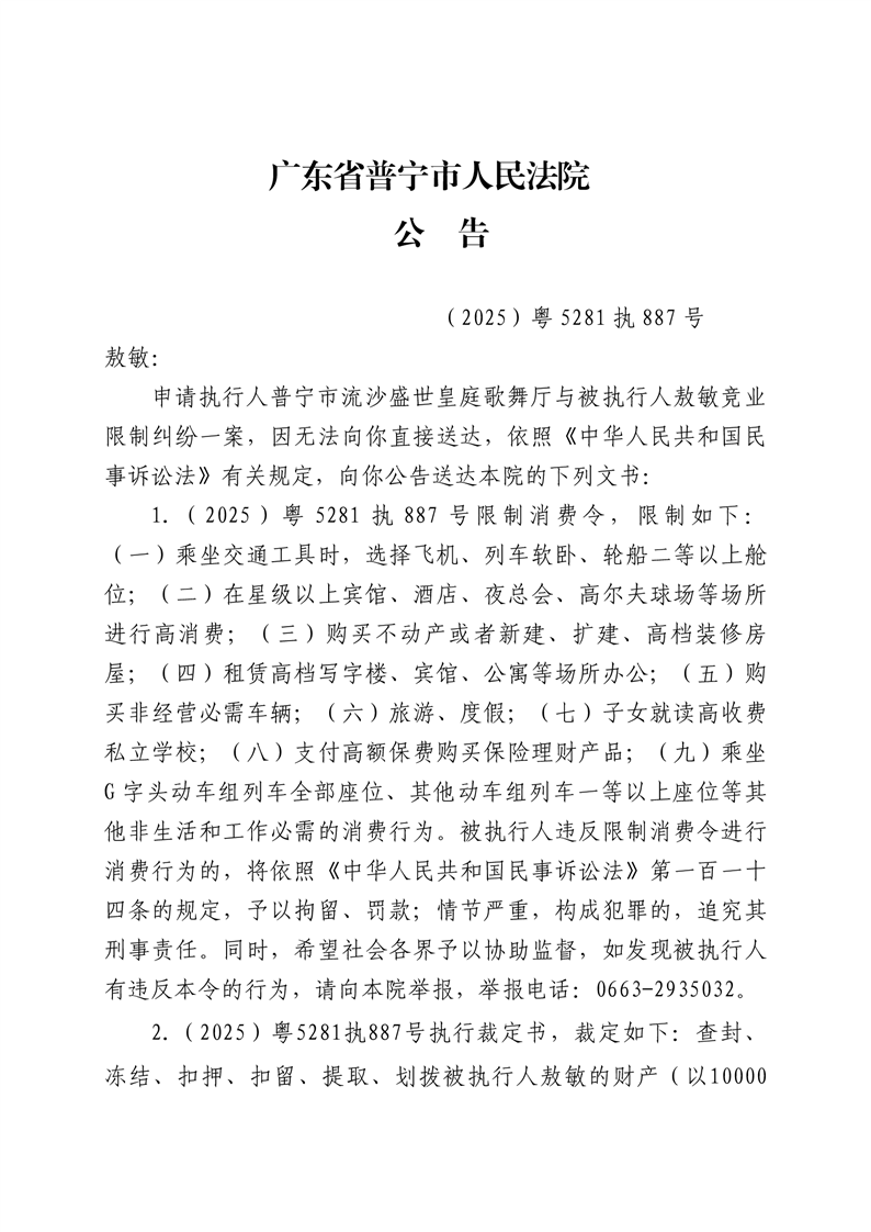 普宁法院送达公告-敖敏