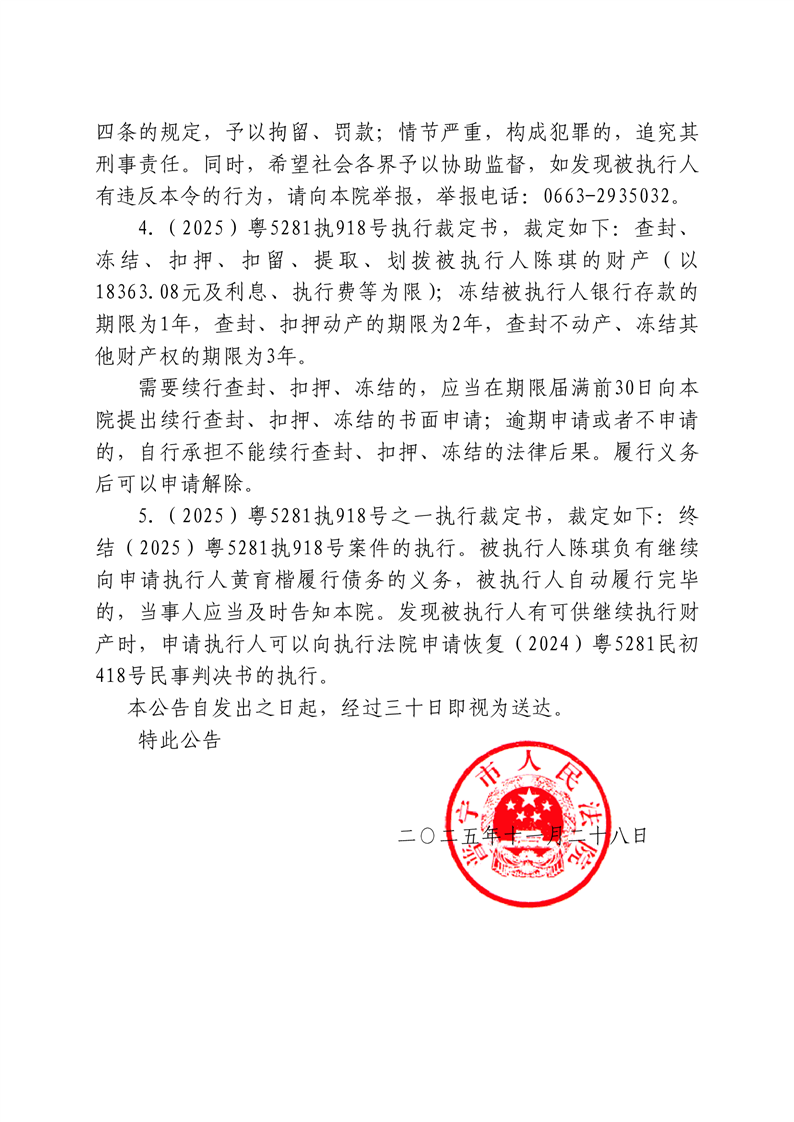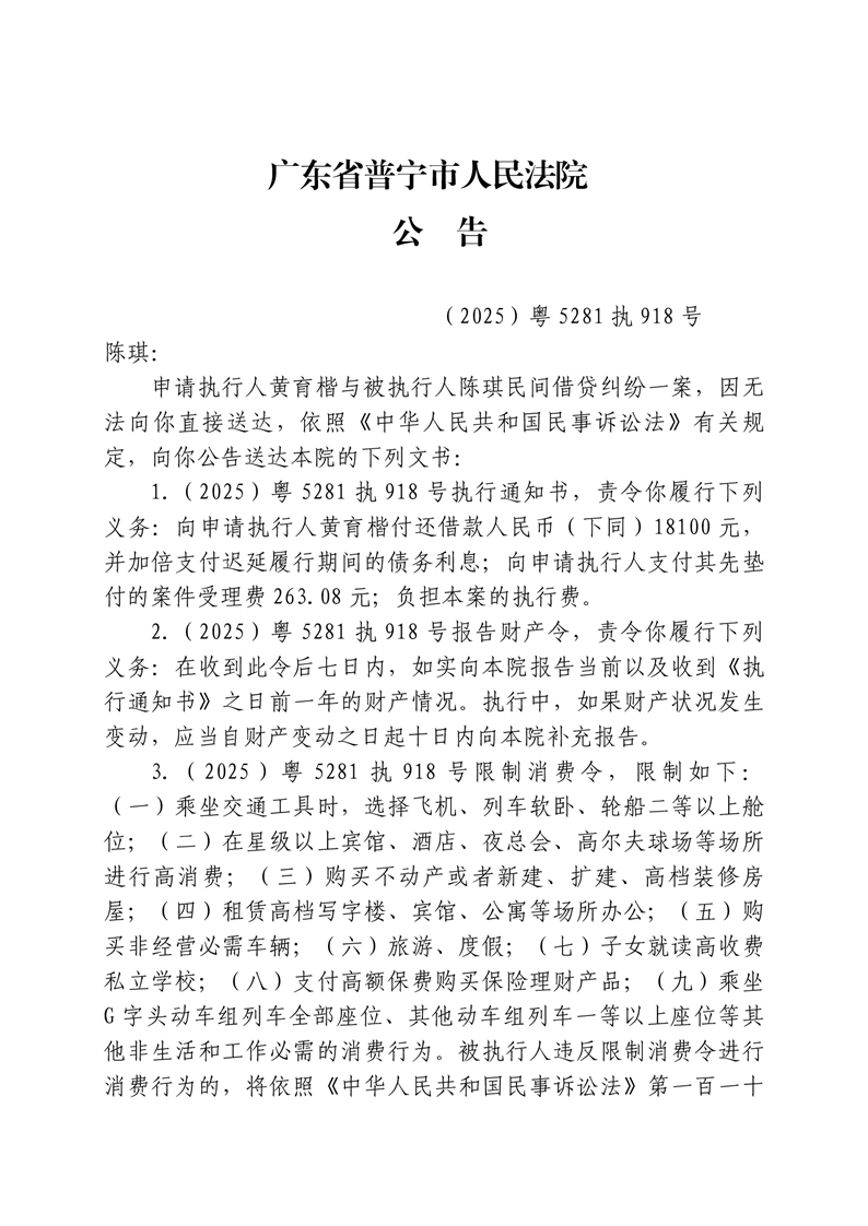普宁法院送达公告-陈琪