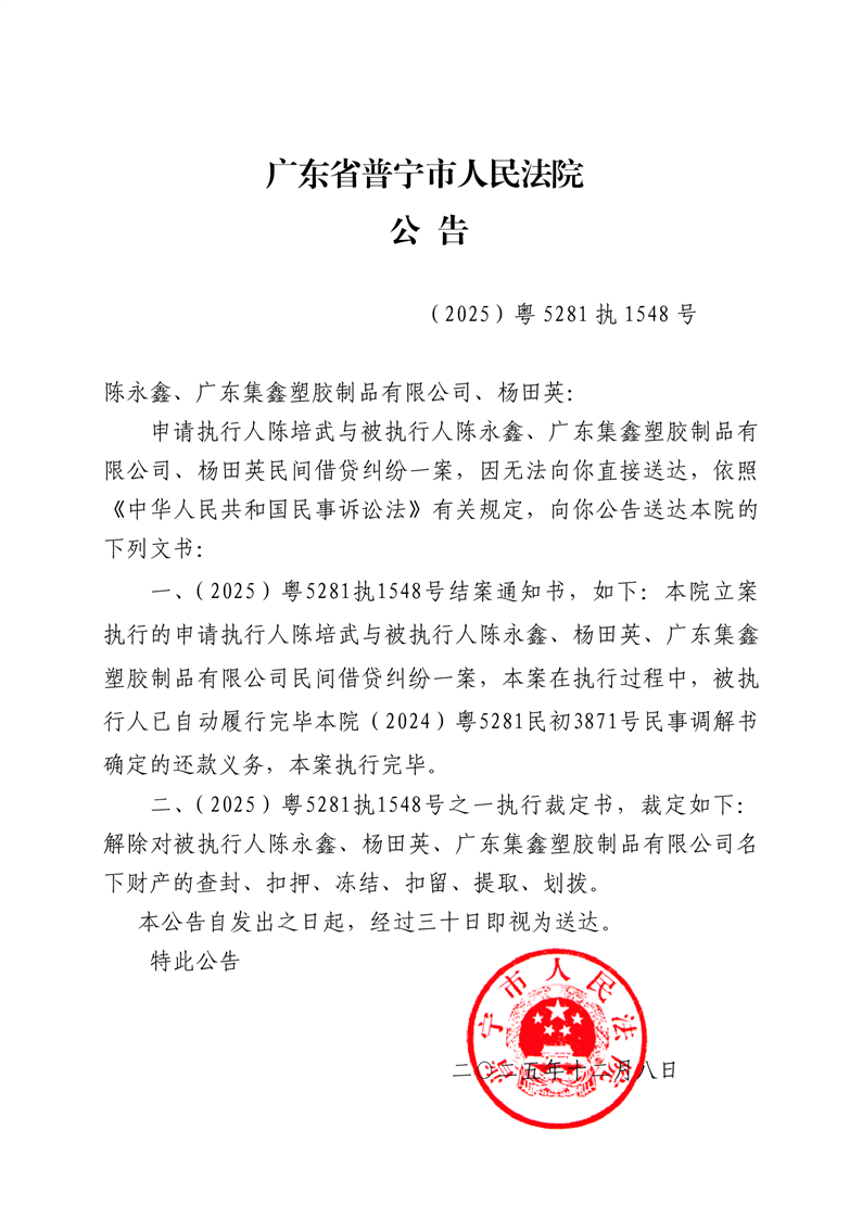 普宁市法院送达公告-陈永鑫、杨田英、广东集鑫塑胶制品有限公司