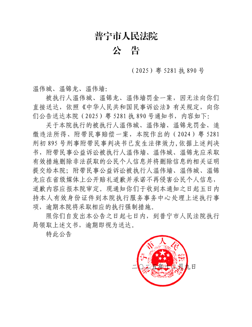 普宁法院送达公告(温伟城、温锦龙、温伟墙)