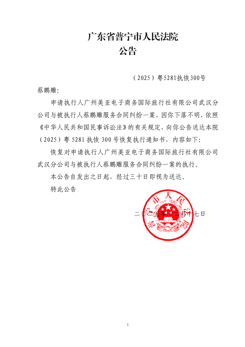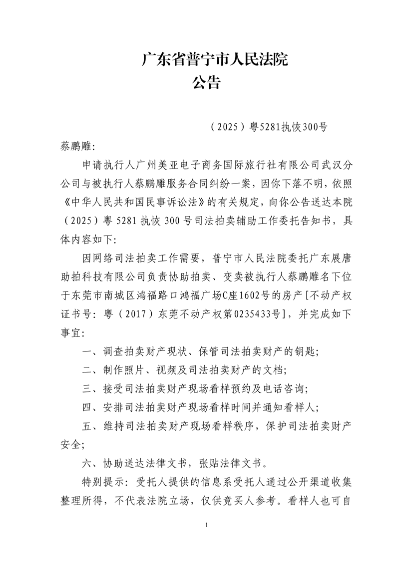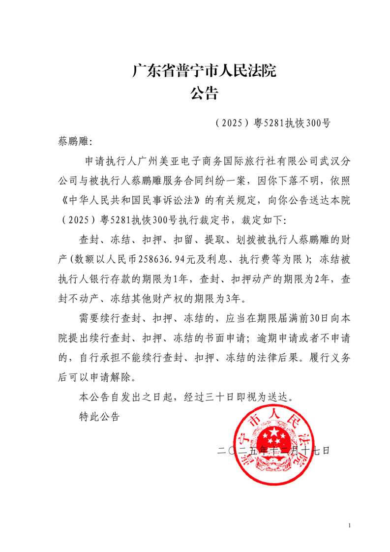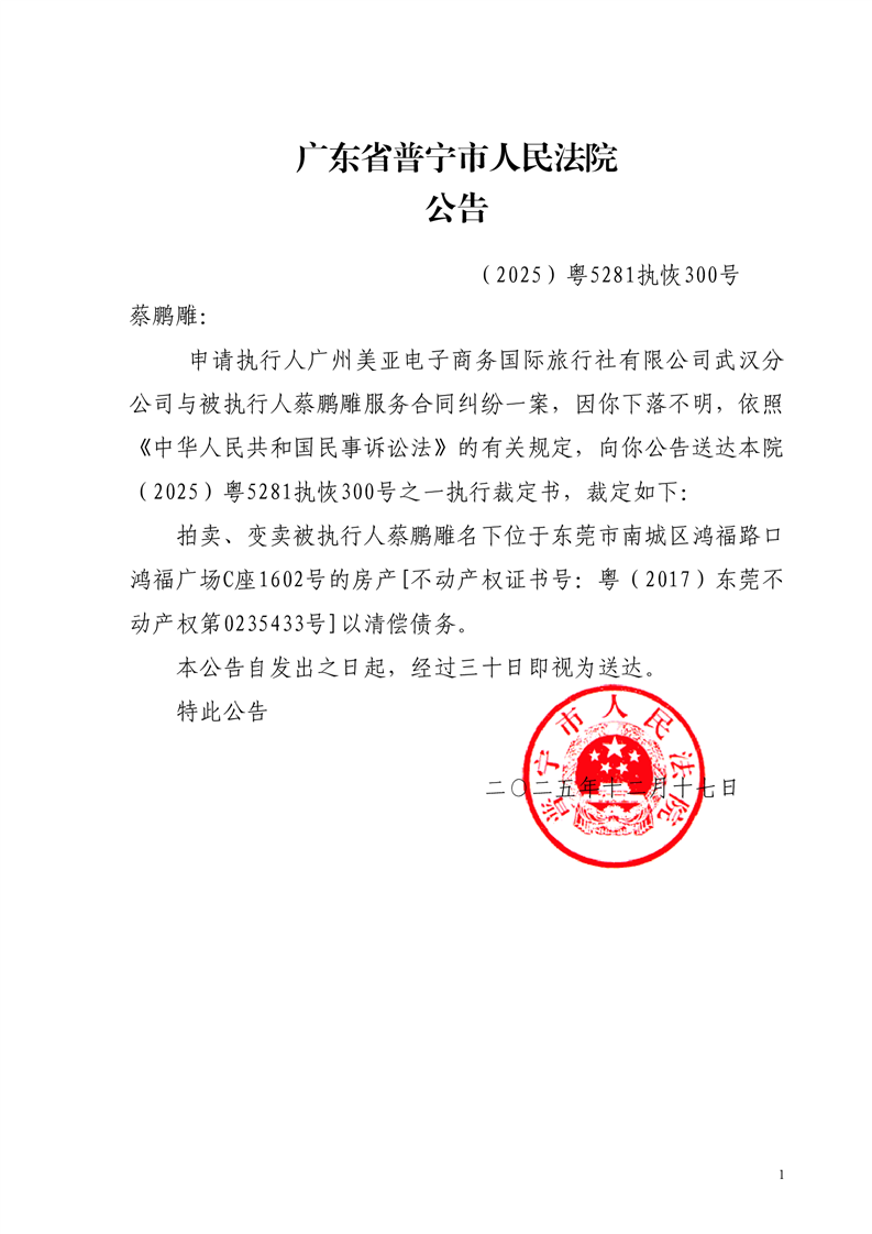 普宁法院送达公告(蔡鹏雕)