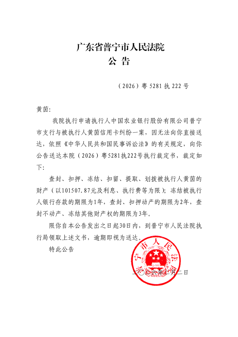 普宁法院公告送达查封执行裁定书(黄茵)