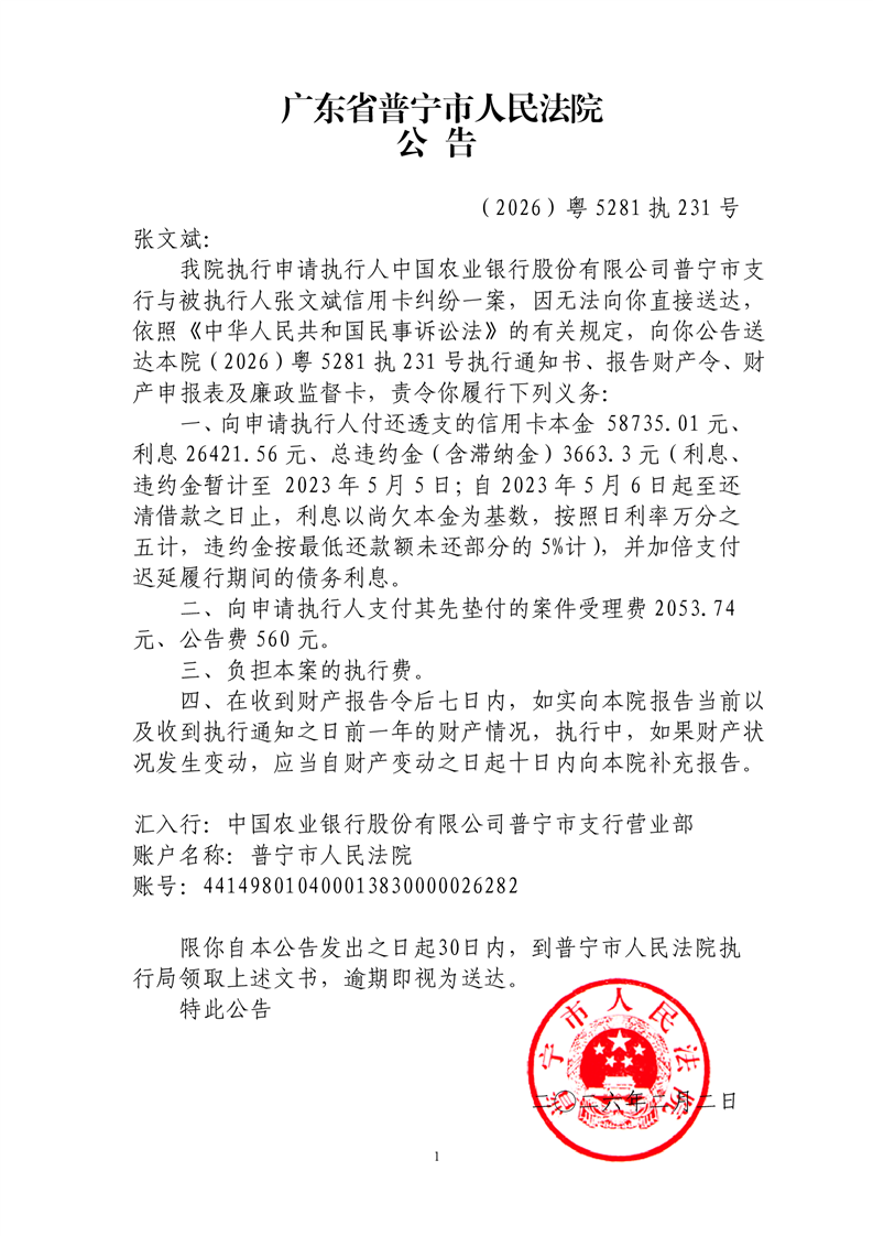 普宁法院公告送达执行通知书(张文斌)