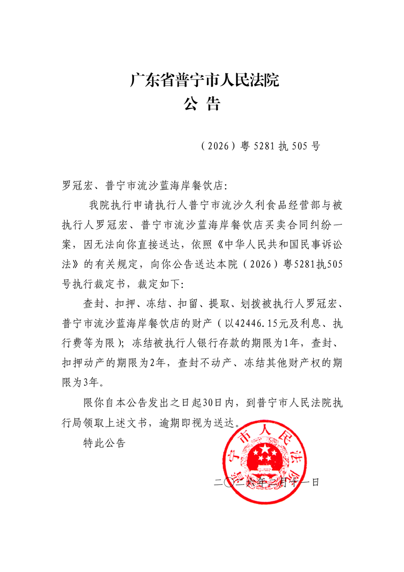 普宁法院公告送达执行裁定书(罗冠宏、普宁市流沙蓝海岸餐饮店)