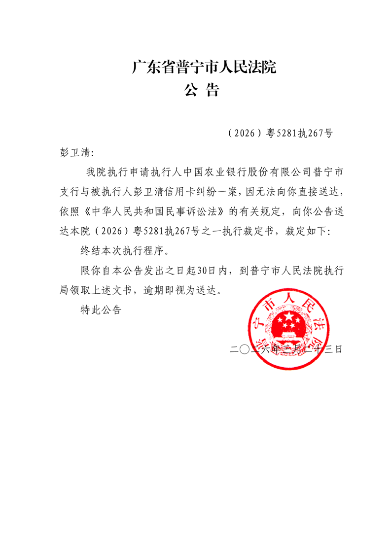 普宁法院公告送达终本执行裁定(彭卫清)