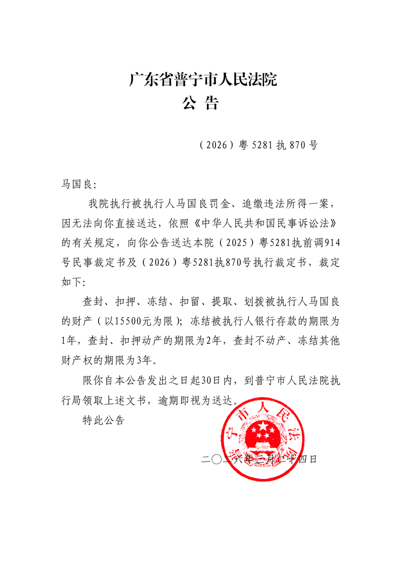 普宁法院公告送达民事裁定书、执行裁定书(马国良)