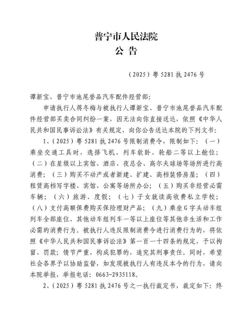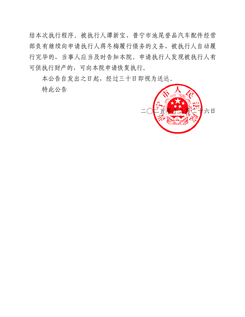 普宁法院送达公告(谭新宝、普宁市池尾誉品汽车配件经营部)