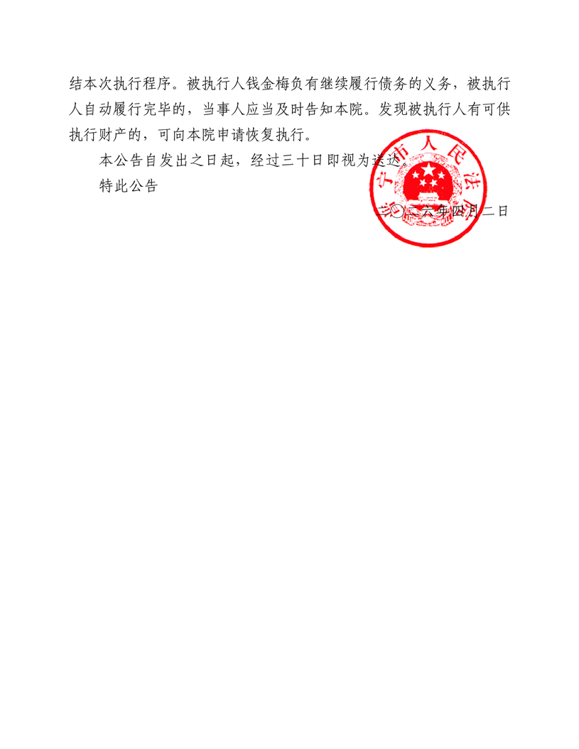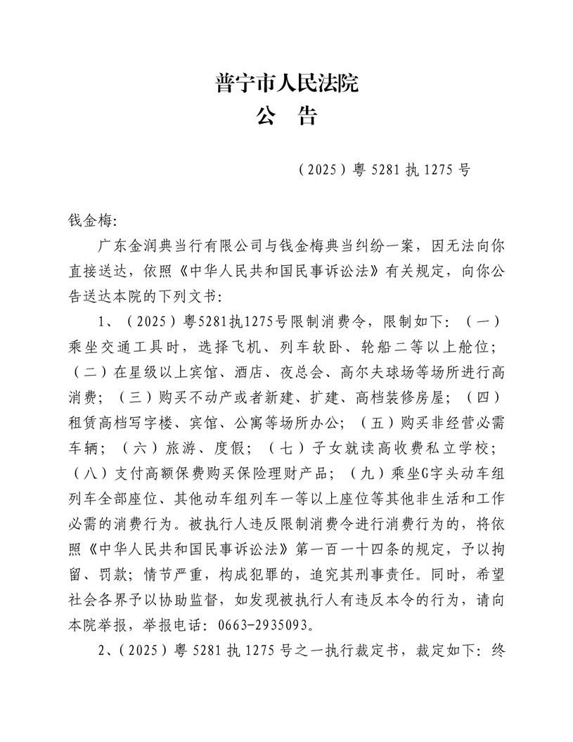 普宁市人民法院公告(钱金梅)