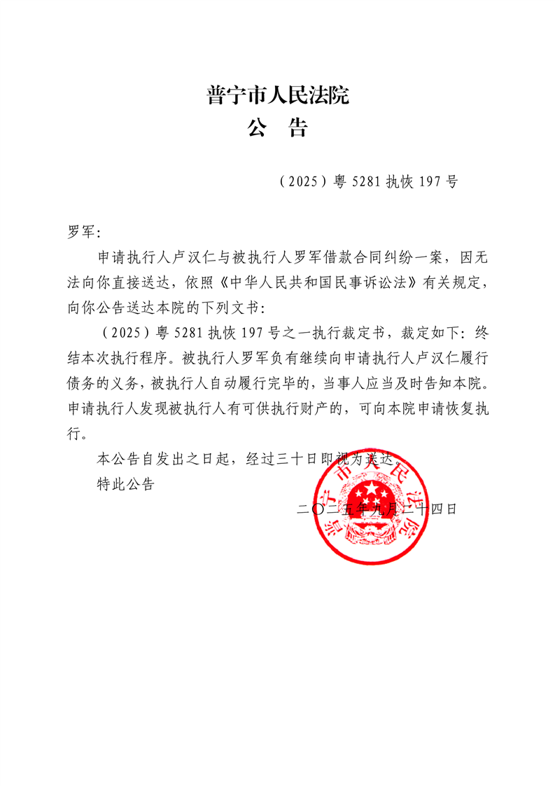普宁市人民法院送达公告(罗军)